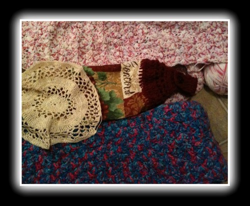 Snowbird land has MANY ironies of life within. Here are pictures of a beautiful golden Victoria Secrets bag Dennis once gave me filled with lingerie and perfume. The heart is still there but the bag is filled with crochet thread and a blanket in the making. The hot pink name is still there but now the giver is Gigi Sue and the recipients will my children and grandchildren! Here I am 1000 miles away from Dennis already for one month and now another month to go! Vicky Secret is but a memory for now. But wait! When Dennis comes to get me we will be ready for a second honeymoon! Maybe I shall hunt for new lingerie and perfume to add a special touch to add to our already warm and yearning hearts. One definitive observation: Absence DOES make the heart grow fonder. I do miss my baby. I do miss my hubby Dennis!! Time passes slowly some days and fast on others. I am thankful to be enjoying the lost art of crochet!! Mom is a great teacher and I am picking her brain and skill sets while i have her close in hand. I am now making blankets, kitchen hand towels to hang on handles, pot holders, coasters, dollies for tables and more! I guess I do have a domestic side hidden away behind teaching, education, administration and NASA for so many years! Dennis for one will be shocked that I sat the computer down, have tried my hand at and learned other more domestic skills, and created many goodies using the near lost art of crochet.