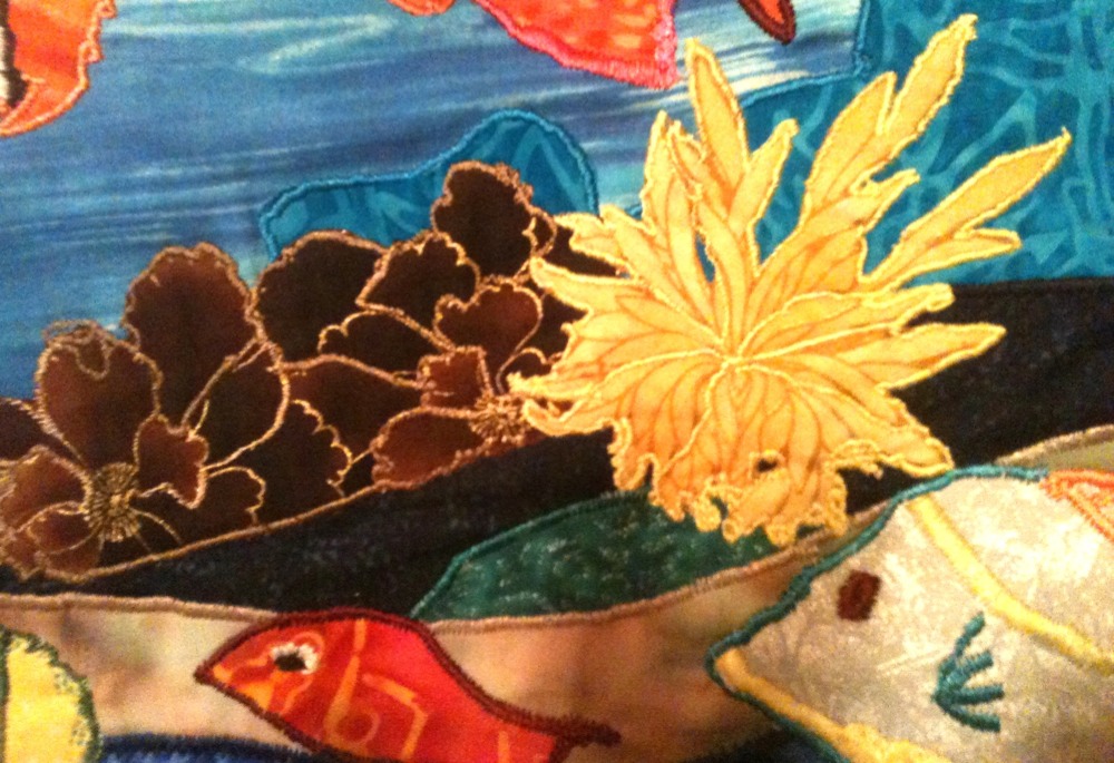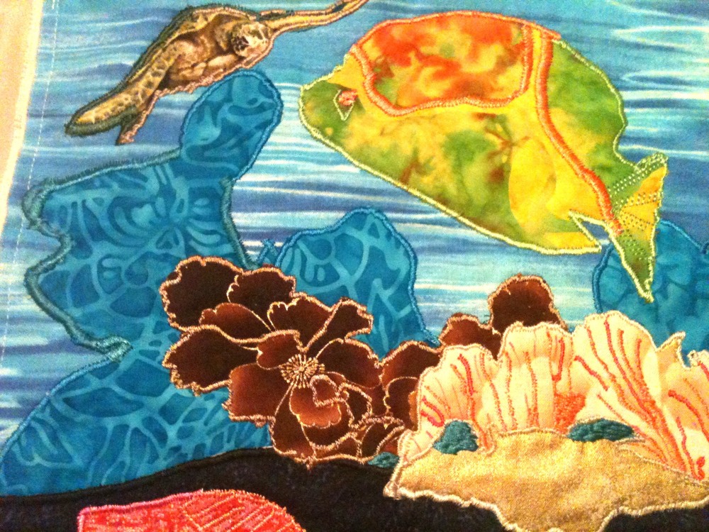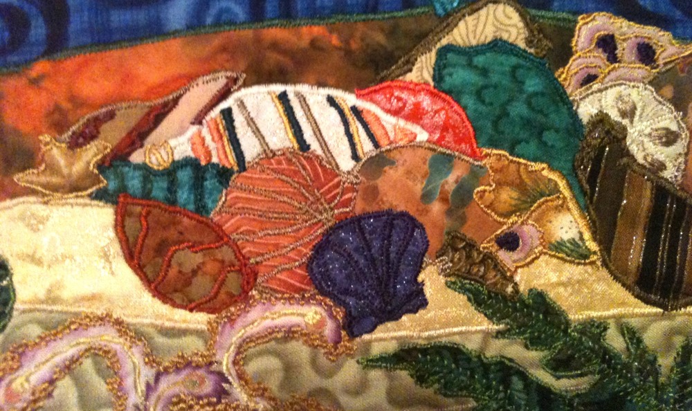 I wanted to use Mom’s good sewing machine to do this project so I was motivated and finished the thread painting tonight. Completing this thread art quilted sea scape and learning to crochet have both been blessings to keep me from going crazy in our cramped conditions.