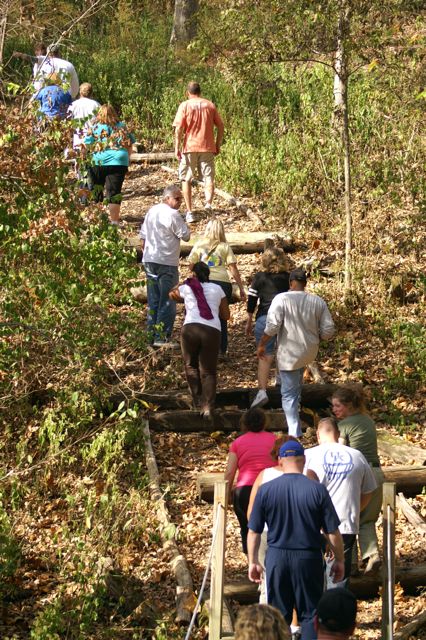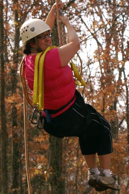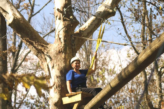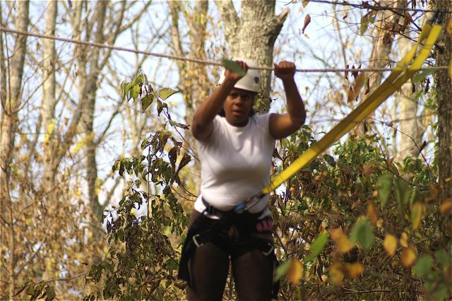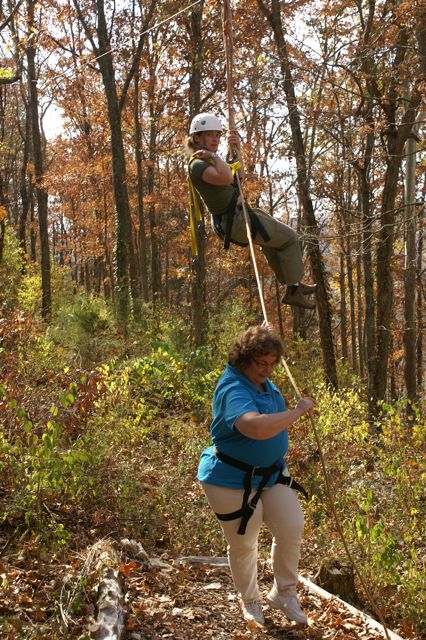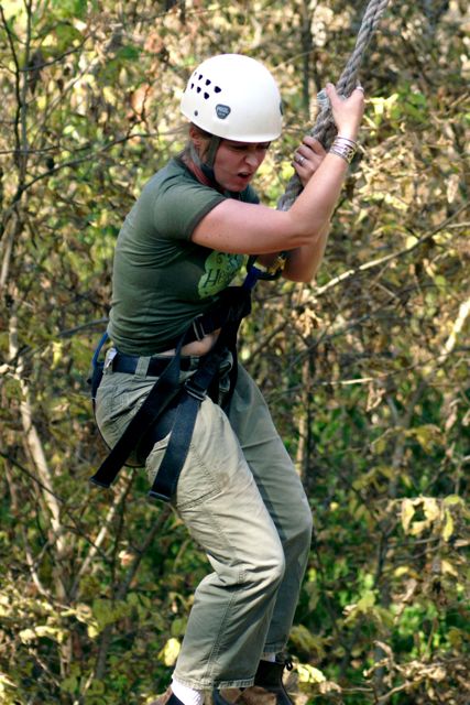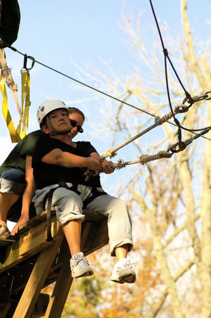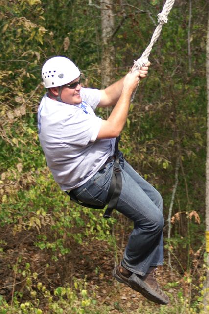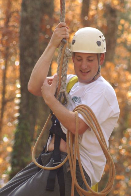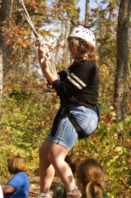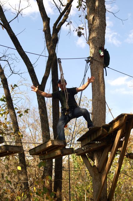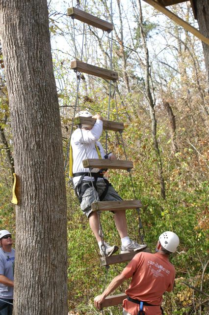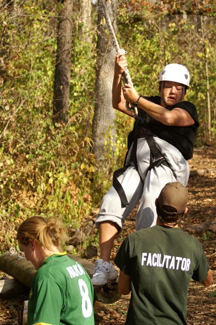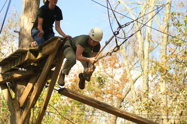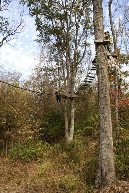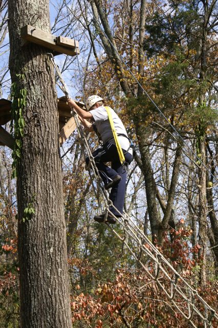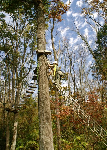 “The Challenge Course at Asbury Colege is an experientially-based outdoor program focused on developing greater leadership, communication, trust, and initiative in teams. Since inception in 1992, the program has served over 25,000 participants of all ages and ability levels. We’ve had guests from middle school soccer players to corporate executives. The Course is located in a beautiful hardwood forest on a 300-acre farm above the Kentucky River Palisades, and is one of the largest and most versatile ropes courses in central Kentucky. High Course Activities: The high course is a series of linear challenges set in hardwood trees, from 20- to 35-feet above ground level. While the challenges inherent on the high course appear to be more individually oriented as participants take the opportunities to challenge themselves on a variety of different activities, the significance of the group support, encouragement , and assistance cannot be discounted. Lessons on risk taking, confidence-building and personal satisfaction can be addressed in a safe environment of personal challenge and support. The Asbury University Challenge Course is constructed of treated wood, cable and ropes, and is inspected for integrity by our staff on a quarterly basis. Each spring a professional consultant assesses the course, the environment, the equipment, and all Challenge Course practices. The Asbury University Challenge Course holds memberships to the Association for Challenge Course Technology (ACCT) and the Association for Experiential Education (AEE). The ACCT is the national body that sets construction and safety standards for ropes course operations. The AEE is the international body which encompasses the varieties of settings and types of outdoor education programs, publishes the Journal of Experiential Education, and supports program integrity with peer review and accreditation. Our construction and program practices are well within the guidelines established by these organizations.” Asbury Website Description