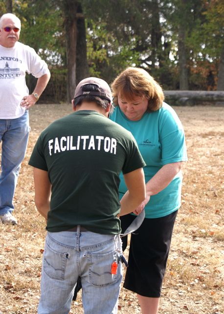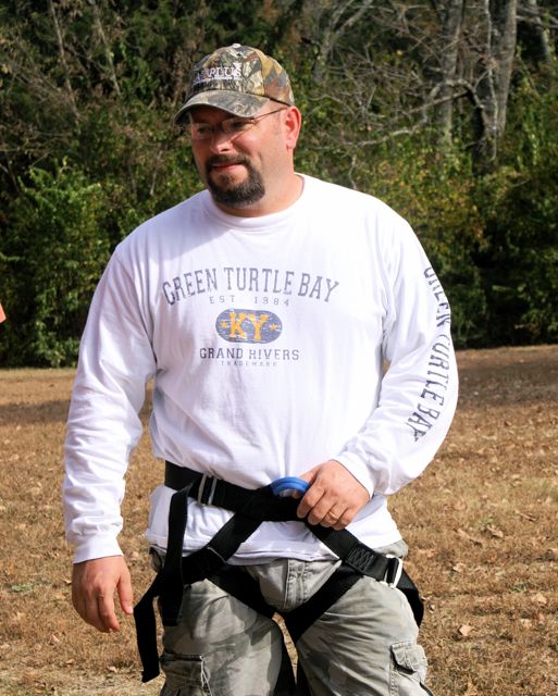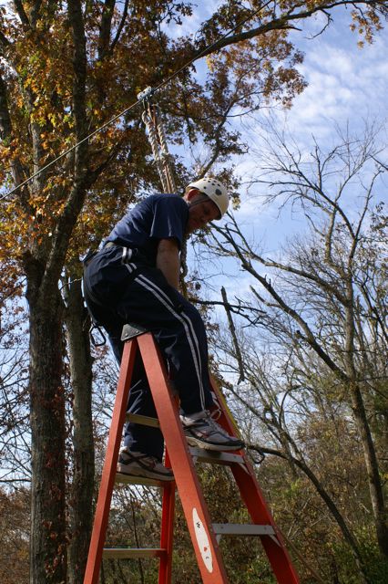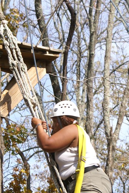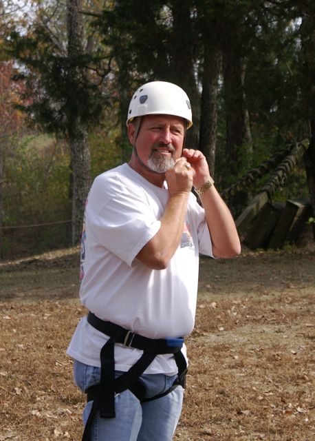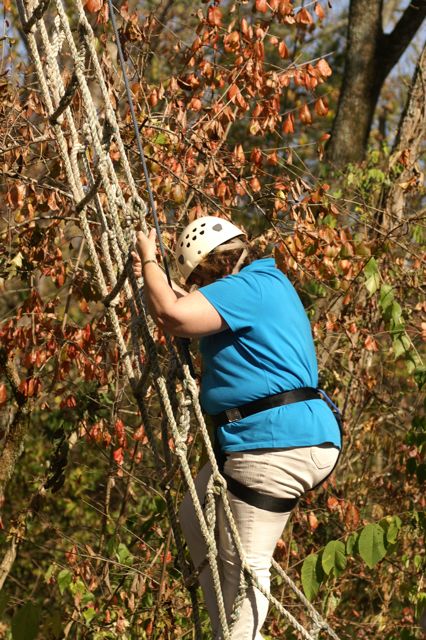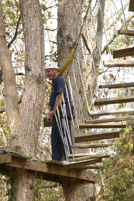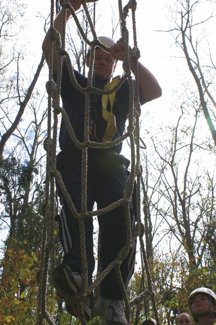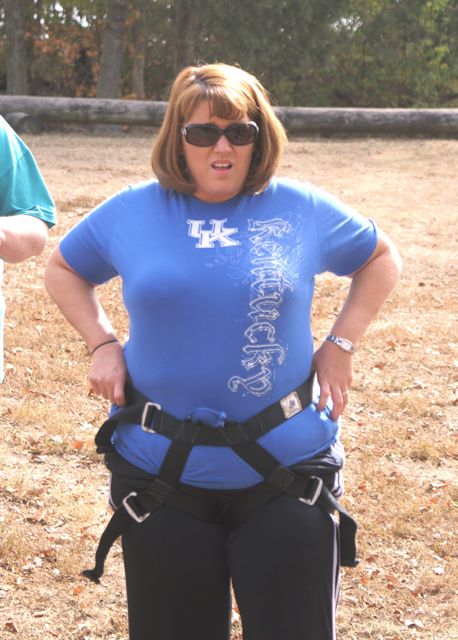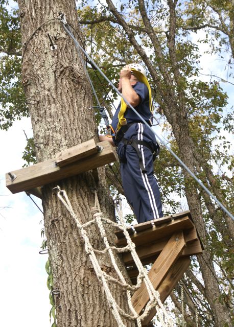 Our first CHALLENGE DAY took place place at Asbury College and included their Low and High Ropes Challenge Courses. On Monday afternoon of our two-day Leadership Frankfort Initial Challenge Retreat, our challenge was for the Team to complete the HIGH ROPES CHALLENGE COURSE 35 FEET ABOVE THE GROUND!!! This was a challenge extraordinaire! With a 200-400 zoom lens Susy and I were able to capture close up facial responses to this scary over-the-top experience of a iifetime! Enjoy the pictures, explanations and our story.