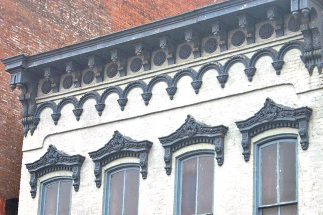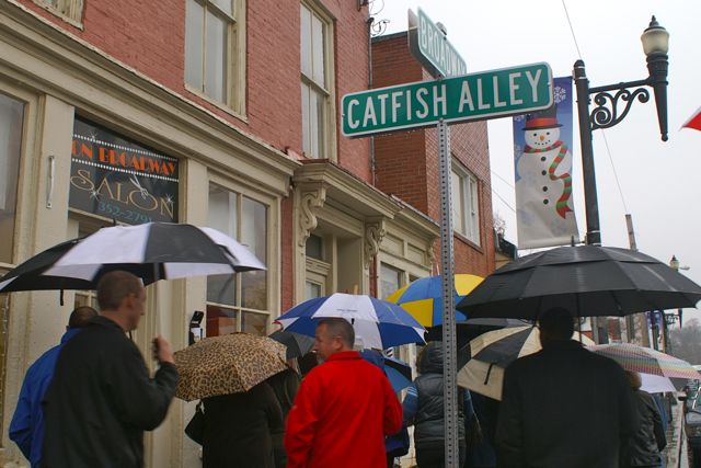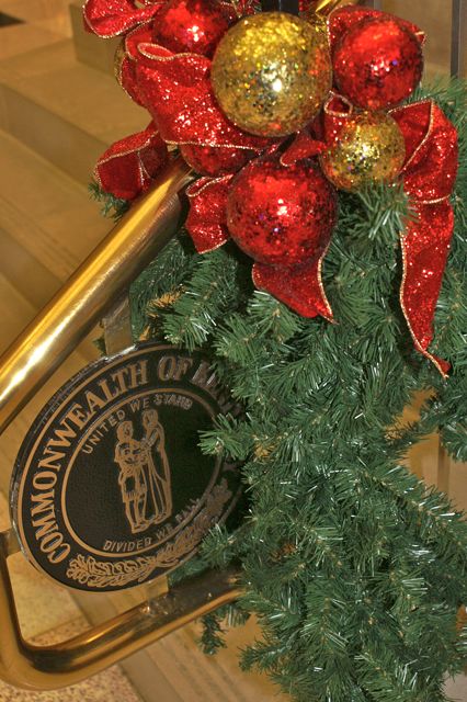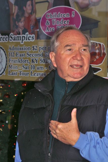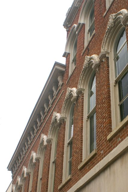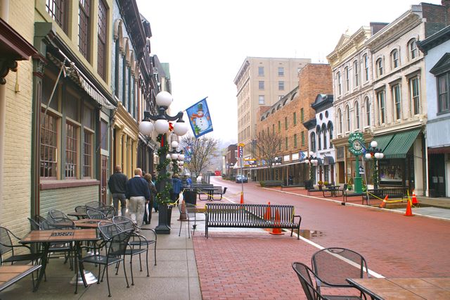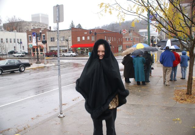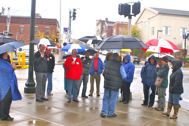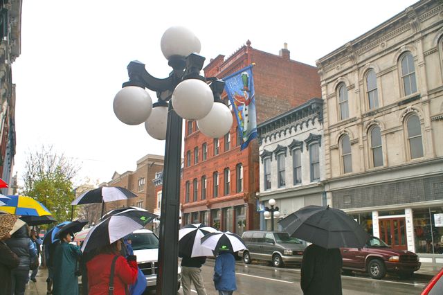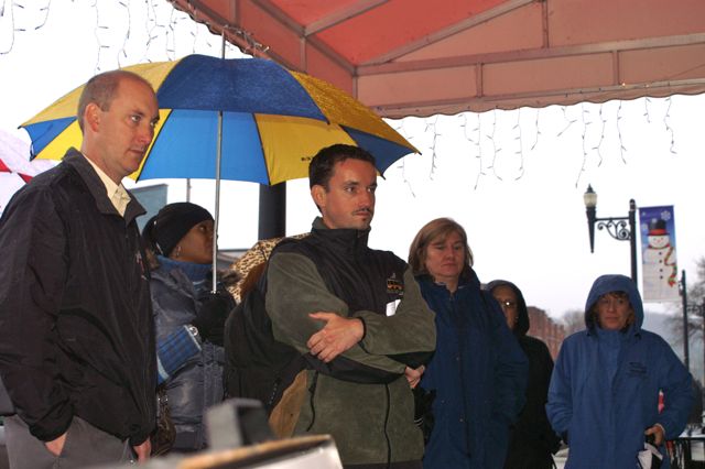 4. Though the clouds covered Frankfort and the rain trickled down, Russ took us on a WALKING TOUR OF DOWNTOWN FRANKFORT. With camera in hand, I could not carry an umbrella but to keep me and the camera as dry as possible I used my black cape. Some of my classmates thought they should capture a picture of me draped in black between takes, so I let them. Despite the rain, the architecture of our town shows very well as do the Christmas decorations in these images.