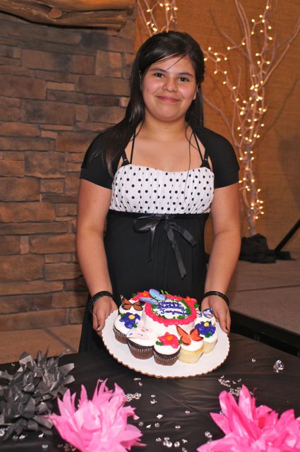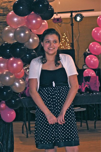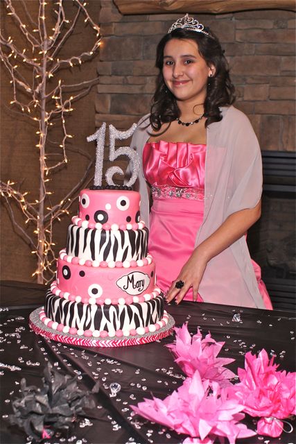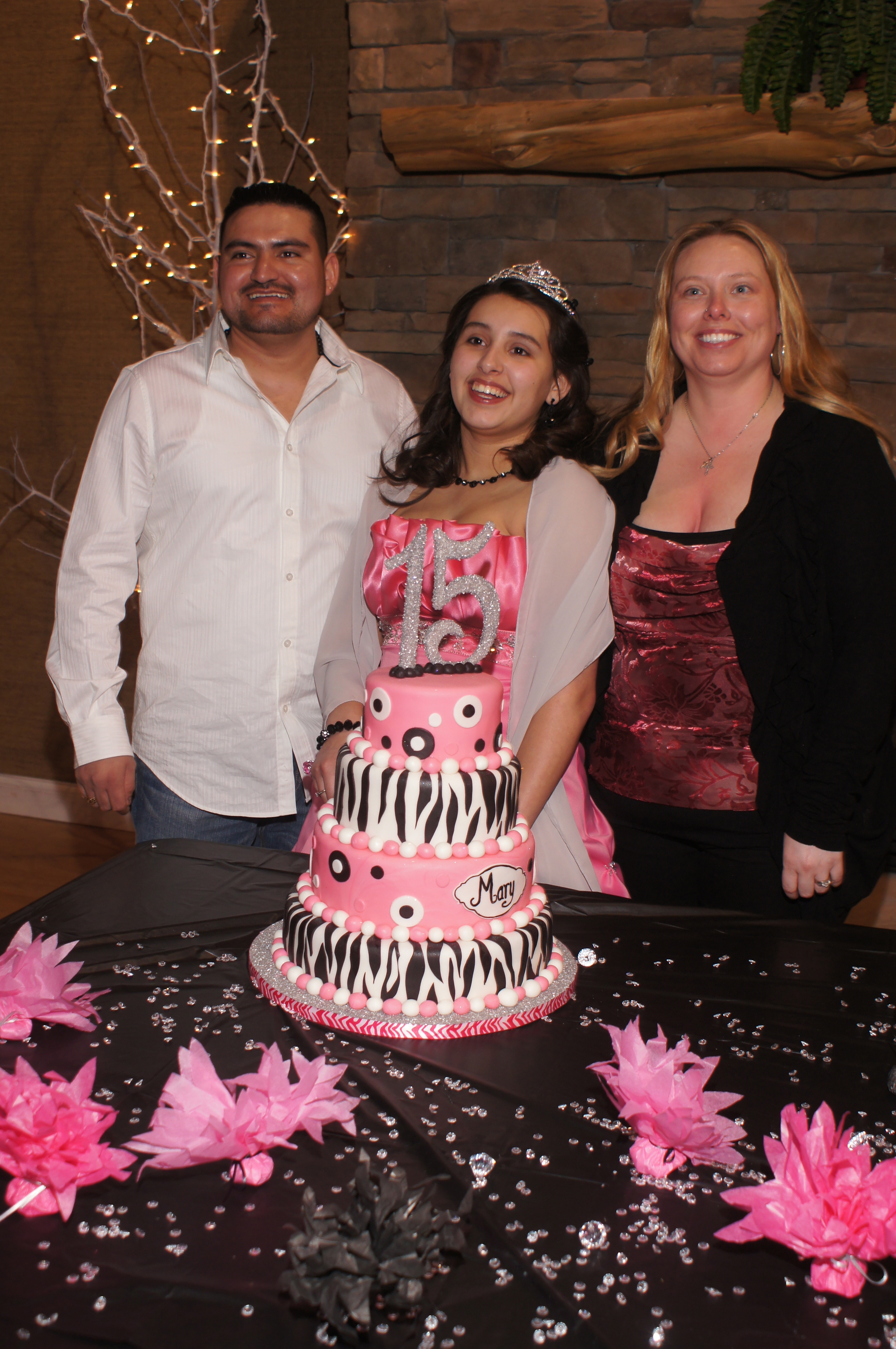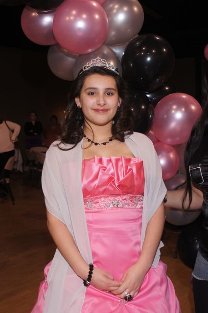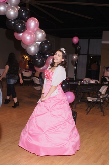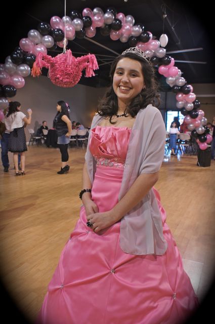 Mary, 15, Pretty in Pink, enjoying her Quinceañera celebration with friends and family.
