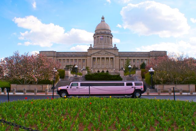 Mary’s Quinceañera gang’s all here in the Pink Hummer Limousine. This Quince Anos with the Pink Limousine makes Mary fit to be a Queen, a Governor or a Senator here at Kentucky State Capitol in Frankfort.