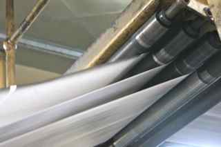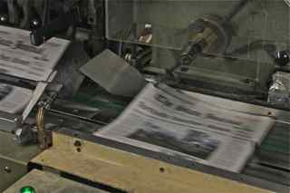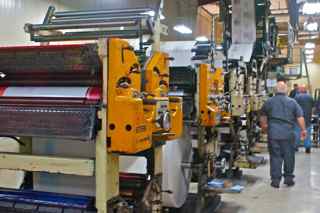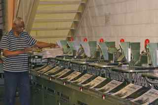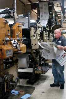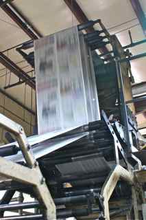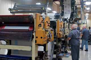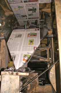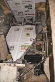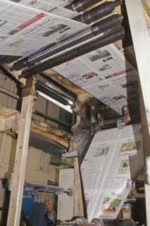 The newsprint winds and turns through the press, more gently than you would think. No tears, no bends, no errors, just perfect newspapers roll out on the belt at the end.