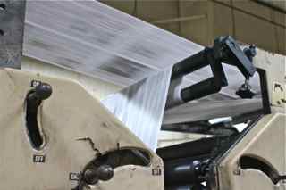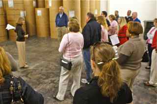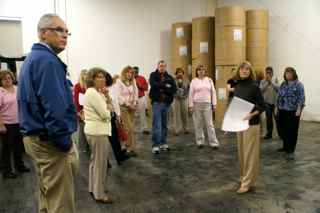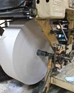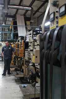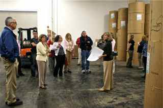 Publisher Ann Maenza answers questions while we wait for the printing presses to start the day’s printing. Here we are in the news print storage warehouse. The news print rolls in the warehouse, shown in these pictures, is approximately enough inventory to produce 45 days of The State Journal newspaper. Full tractor trailer loads of newsprint are purchased at one time in an effort to save fuel and shipping expense. Each State Journal daily paper requires 2 of these huge rolls of newsprint and a Sunday paper requires 3 rolls.