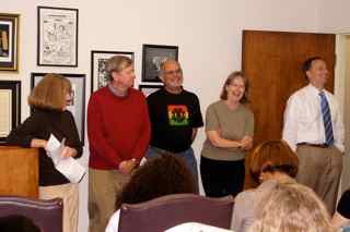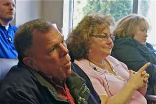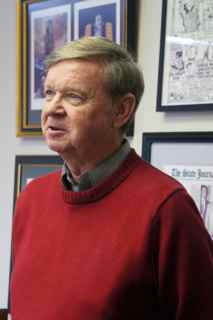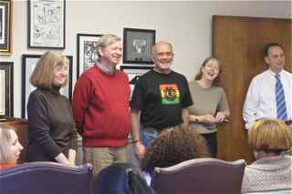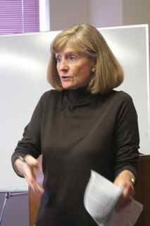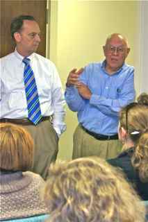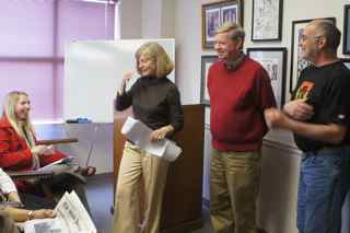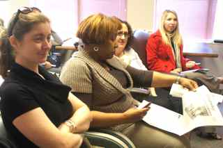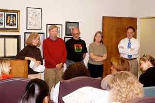 The State Journal staff members Publisher Ann Maenza, Opinion Editor Ron Herron, Reporter Charlie Pearl, Advertising Manager Lloyd Lynch, Spectrum Editor Phillip Case, and Reporter Katharine Wasson gather in front of the Leadership Frankfort Class Members to frankly discuss issues important to the community and the local newspaper process. The candid conversation was completely honest. Discussions twisted from laughter and smiles into more serious tones concerning the newspaper’s current obituary policy. Katherine Wasson, a young staff reporter was called in when the discussion turned to current social media and its effects on the newspaper industry. The State Journal can now be found on Facebook and Twitter.