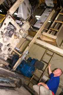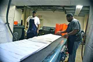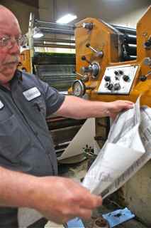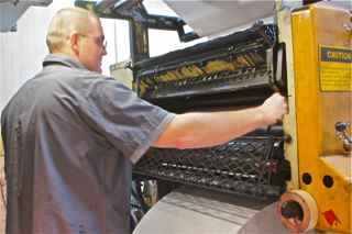 Nathan Sanford receives the bent plate from Ray Vangundy and then secures the positive print aluminum plates to the printing cylinder of the press.