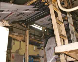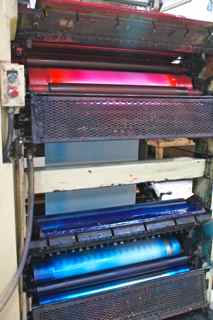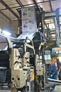 The next set of images shows the State Journal offset printing press room, with the huge web press and the staff printing the daily newspaper. This printing press is known as a web press because it uses streaming rolls of newsprint instead of individual sheets of newsprint. The process is called offset because the positive-image, metal plates do not touch the paper going through the press. Instead, the plates transfer their inked image to a roller which prints the newspaper pages. The press is huge, as you can see in the pictures. The press itself is 2-3 stories high and fills the press room that looks to be the size of a football field. Offset printing presses use the giant newsprint paper rolls that we had just seen in the storage warehouse. It is amazing that this massive printing press did not tear nor damage the comparatively delicate newsprint as the process wound newsprint off the bulky rolls. The newsprint winds up and down, back and forth through the press. The web press prints black, white and color pages, cuts individual pages in the appropriate sequence, divides pages into separate sections of headline news, spectrum, sports and classifieds, and then finally folds completed newspapers with multiple sections ready to stack and disseminate and distribute appropriately.