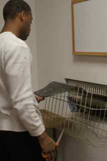 Here Jordan Morgan watches the full-page photographic negatives print, he records the time each page is printed, then cuts each negative and passes it on to Stephen Estes who uses the plate burner machine to make the aluminum plates that will be mounted on the printing press to print the newspaper.