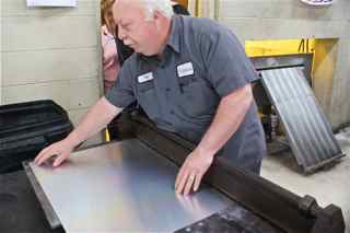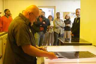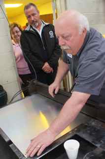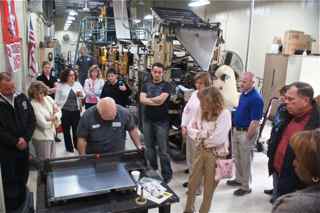 Ray Vangundy is bending one of the plates as the Leadership Frankfort class looks on. Each plate is bent so that it can be secured to the cylinder of printing press.