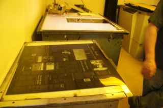 Stephen Estes, Press Foreman, shows Leadership Frankfort members the full-page photographic negative before he places it on the plate burner machine to produce the aluminum plates for printing. This plate burner machine etches the image of each newspaper page onto thin aluminum plates. Pages with color photos or type require extra plates. The plates have a positive image of the page.