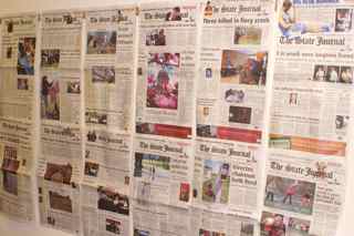 As we leave the press room and head to the conference room for more Q & A with staffers, I spot another Kodak moment. The staff has the headlines pages for two consecutive weeks posted on the newsroom wall to keep the current events fresh on their minds.