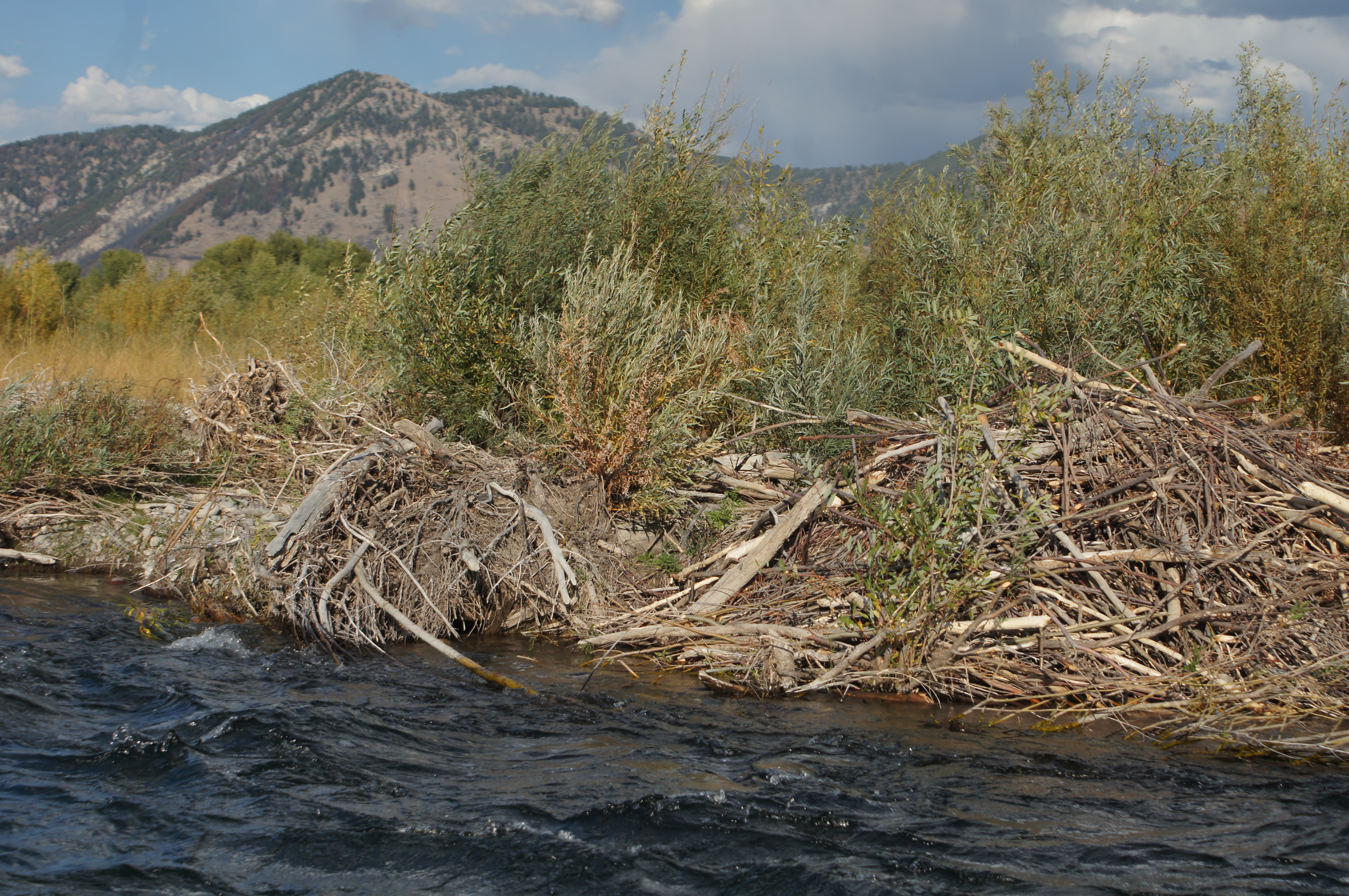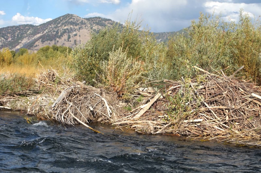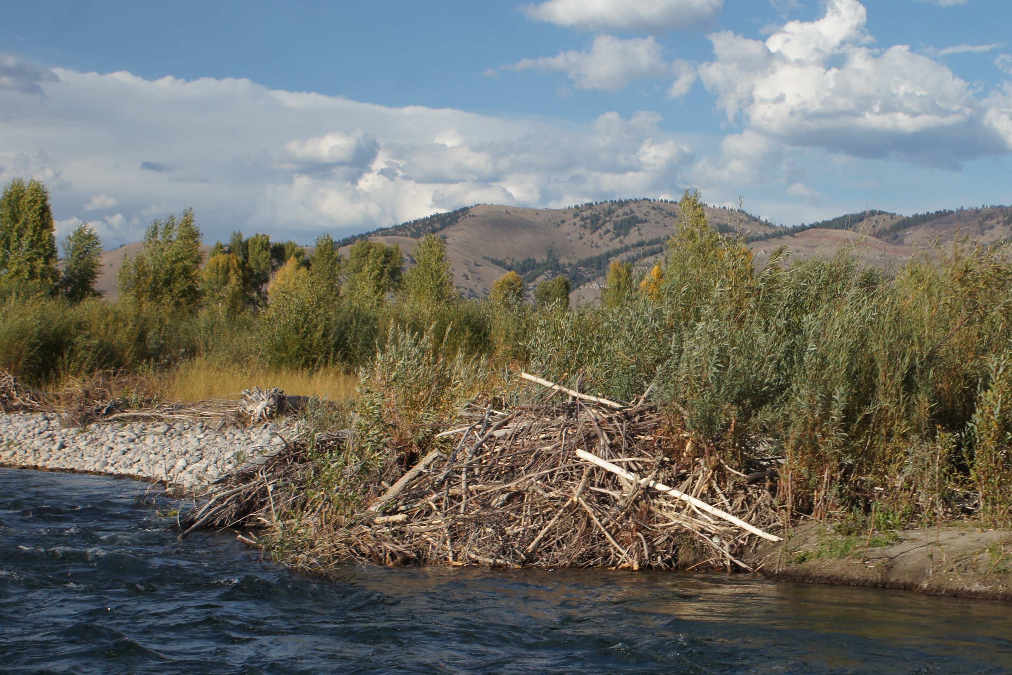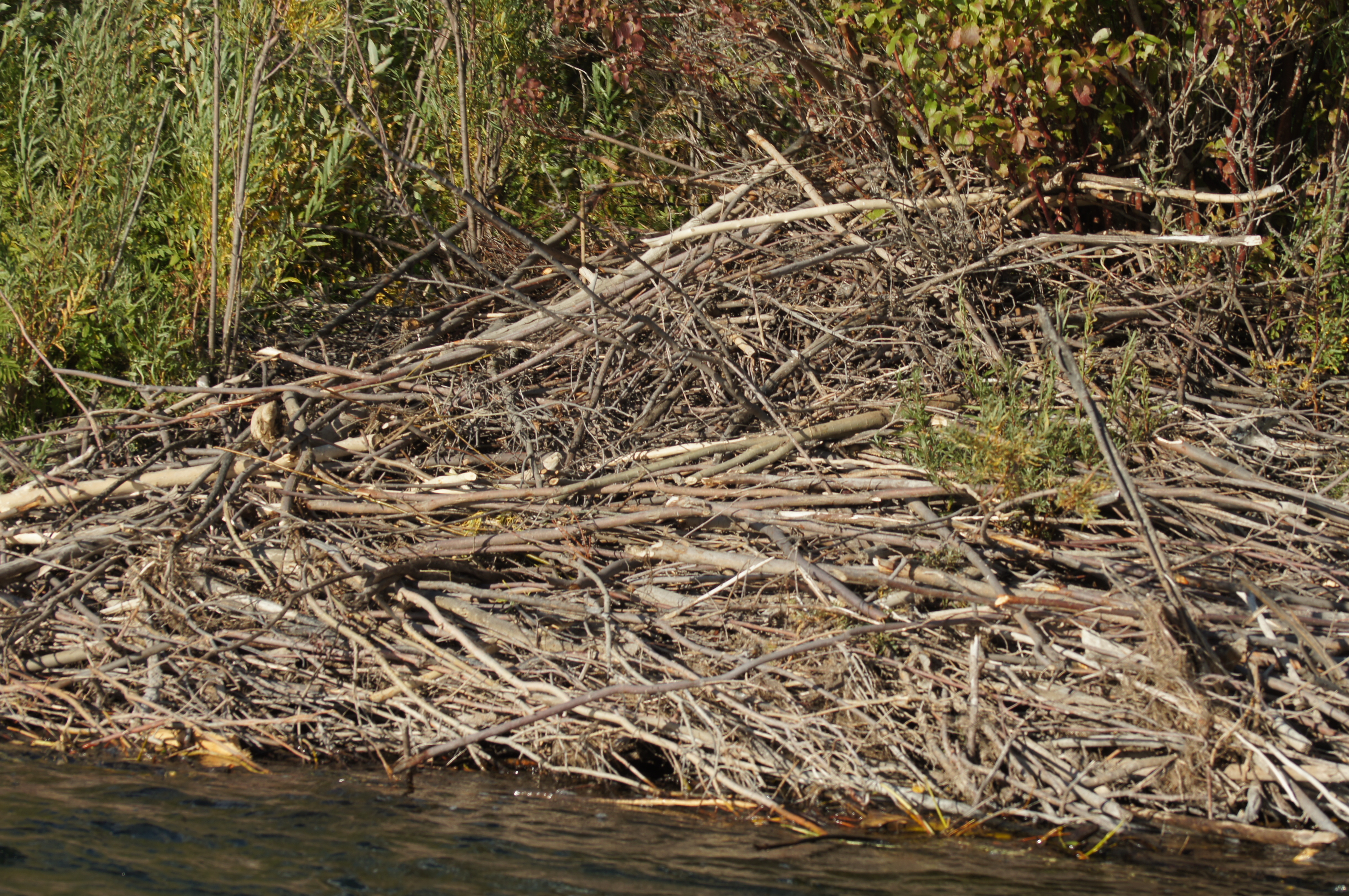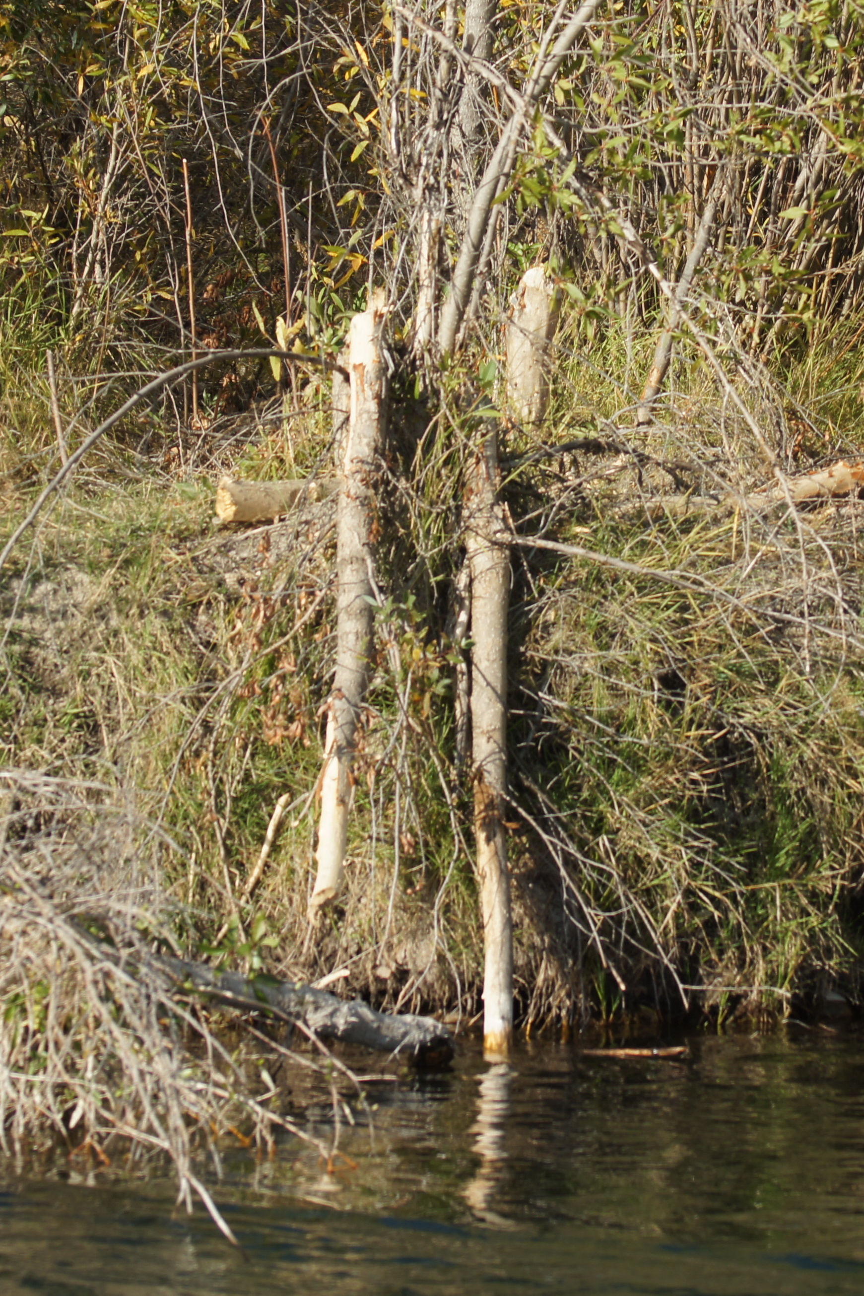 Floating along side the Grand Tetons, the youngest mountain range of the Rocky Mountain Chain, we caught a glimpse of these beaver dens.Trees having been cut recently by the local beaver are shown before the beaver carry them off to build the den or the dam. Interesting to see in this habitat along the Snake River in the Grand Teton Mountains.
